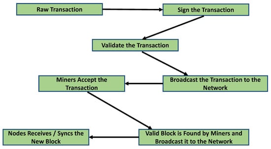 In Buterin’s article [], Ethereum was presented to cover some shortcomings of Bitcoin. Ethereum then supports the status of the contract, as well as some other changes to the framework of the blockchain. Ethereum is made up of a network of cryptographic, or protected, public documents that are hard to alter because they are stamped with user data, time and date, and modifications that must be accepted by all users []. Anyone may establish a financial arrangement or hold debt or ownership registries on the ledger, removing the need for a third-party record-keeper or trust officer. They are called “trustless” transactions, and they do not include trusting the transaction’s counter-party. Ethereum is a permissionless, non-hierarchical computer (node) network that builds and decides on an ever-growing sequence of “blocks” known as the blockchain. Whenever a node attaches a block to the chain, the transactions are always executed in their order and modify the Ethereum account storage values. A relatively small subset of the network, known as its peers, connects with each node. The transaction flow of Ethereum is depicted in Figure 3. Whenever a node tries to add a new transaction to the blockchain, it sends it to its peers, who send it to their peers, and so on. It travels across the network this way. Some nodes, known as miners, hold a list of all these recent transactions and use them to create new blocks, which are then sent to the rest of the network. Whenever a node receives a block, the validity of the block and of all its transactions is checked and, if correct, added to its blockchain, and all such transactions are executed. A node can obtain competing blocks, which may form competing chains, since the network is non-hierarchical. The network achieves unity on the blockchain by applying the “longest chain law”, which specifies that the canonical chain is the one with the most blocks at any given time. Since miners do not want to spend their computing energy attempting to connect blocks to a chain that would be abandoned by the network, this rule achieves consensus.