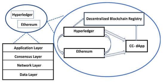 This methodology considered each blockchain as a self-contained system that connects with others via a cross-chain protocol that includes a notary mechanism. Interoperability gateways are created by nodes on both public and private blockchains. To encourage interaction across blockchains, decentralised blockchain registries that can recognise and address blockchains and their components (e.g., smart contracts and certificate authorities) can be utilised []. A repository for both public and private blockchains might be created on a public blockchain with solid security assumptions []. The registry’s information is maintained in a customised shared database administered by significant blockchain players []. The decentralised repository would work similarly to a decentralised domain name structure.