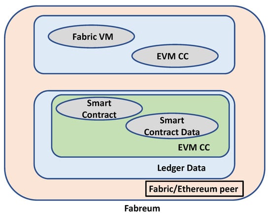 Consolidating all of these data resulted in the creation of a new architecture for addressing the interoperability issue. Figure 5 shows a concept for the Hyperledger Fabric chaincode, which includes Ethereum integration. Ethereum is a permissionless and EVM-based blockchain, while Hyperledger Fabric is a permissioned blockchain. An Ethereum blockchain node’s interaction endpoint (i.e., IP address) is registered with the blockchain registry. After that, it looks for the address of a Hyperledger fabric server with which it is supposed to communicate. The Cross-Chain Communication Protocol (CCCP) and the Cross-Blockchain Communication Protocol (CBCP) provide for unidirectional or bidirectional interoperability (CBCP). Because the Hyperledger node interprets Ethereum’s block headers but not the other way around, a CBCP allows the Ethereum and Hyperledger nodes to communicate arbitrarily. A CC-dApp that is already linked to Ethereum and Hyperledger fabric utilises the private blockchain to create the required credentials after getting its address from the blockchain registry. A CC-dApp protocol lets an end-user achieve semantic interoperability by utilising Hyperledger fabric and Ethereum. These actions establish blockchain connection, culminating in the establishment of connection among Hyperledger Fabric and Ethereum. Existing blockchains would require changes to multiple levels, including the network, consensus, contract, and application layers. In essence, this work uses the Hyperledger Fabric permissioned blockchain infrastructure to allow users to interact with Ethereum smart contracts written in an EVM (Ethereum virtual machine) compatible language called Solidity. To complete the integration, the EVM chaincode (EVMCC) and the web provider are utilised. The EVMCC is a Go chaincode that encapsulates the Hyperledger fabric EVM bundle and maps out the various ways between the peer and the EVM. The EVMCC acts as a smart contract runtime, placing the implemented contract code on the ledger in the EVMCC namespace. Users may connect with smart contracts running in the Fabric EVM using tools like Web3.js. A proxy that provides a subset of Ethereum-compliant JSON RPC APIs. The Fabric GO SDK allows the proxy to connect to the Fabric network and communicate with the EVMCC. The Ethereum Smart Contract Runtime and the Hyperledger Fabric Runtime are being rebuilt by the EVMCC and proxy. Applications that employ the Ethereum JSON RPC API and EVM smart contracts should be able to interact seamlessly with Hyperledger Fabric. Fabreum is the name given to this innovative design since it functions as both Ethereum and Fabric as shown in Figure 6.