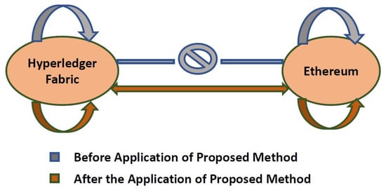 The permissioned blockchain requires every peer to execute every transaction, maintain a ledger, and run a consensus (which will be explained in Section 2.2), a fault-tolerant mechanism. It cannot support the valid private transaction with confidential contracts. Hyperledger Fabric is one of the best blockchains which can deliver the modular and secure foundation for the industrial blockchain. The hyperledger fabric generally uses a practical Byzantine Fault Tolerance ( PBFT) consensus algorithm. However, some factors pull back the industries from adapting the blockchain fully fledged. Interoperability among platforms is one among them. Interoperability indicates the possibility to freely share value across all blockchain networks without the need for intermediaries. Interoperability among enterprise systems is defined by Vernadat as “a measure of the capacity to execute interoperation between entities” (processes, software, systems, business units) []. The issue is to make it easier for various processes and units to “communicate, cooperate, and coordinate”. Technical interoperability, legal interoperability, semantic interoperability, integrated public service governance, organizational interoperability, and interoperability governance are some of the interoperability levels. Technical interoperability, for example, is concerned with the technical processes that enable blockchain integration, whereas organizational interoperability is concerned with whether different organizations can work together across different blockchains a shown in Figure 1.