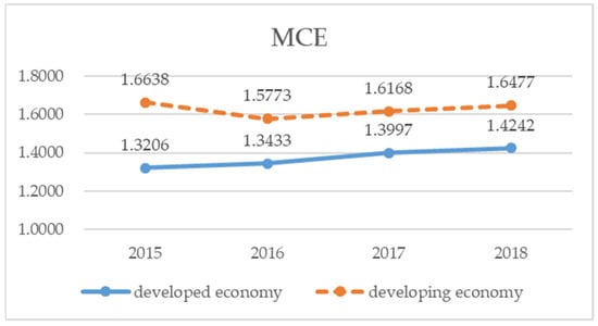 The SMF regression method was used to compute both the TGR and MCE of the banks in the developed and developing Asian economies. Figure 1 shows the TGR of the two groups of banks. The banks in the developed economies had average TGR values between 1.0065 and 1.0070. The banks in the developing economies had average TGR values between 1.0739 and 1.1134. The TGR values of the banks in the developed economies are closer to one (1) than those of the banks in the developing economies. The bank group cost of the developed Asian economies is closer to the metafrontier cost, which means they managed costs better. The TGR of banks in the developing economies rose from 2015 to 2018. The increase in the technology gaps each year from 2015 to 2018 suggests that banks in the developing Asian economies deteriorate in their abilities to control costs.
