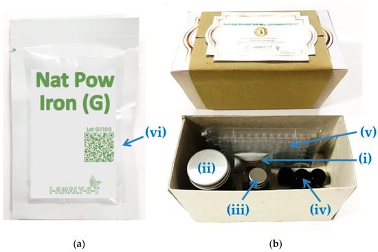 The natural-reagent iron assay kit (Figure 1b) consists of (i) a sachet of Nat Pow Iron (G), (ii) a vial for extracting the natural reagent, (iii) a vial containing the iron(III) standard, (iv) a vial containing buffer solution, (v) a 96 wells microplate as a reaction platform and (vi) instructions for the reagent preparation as shown in Supplementary Material: Figure S1, which can be accessed by scanning the QR code on a sachet of Nat Pow Iron (G). The chemicals and conditions used were optimized as reported previously [].