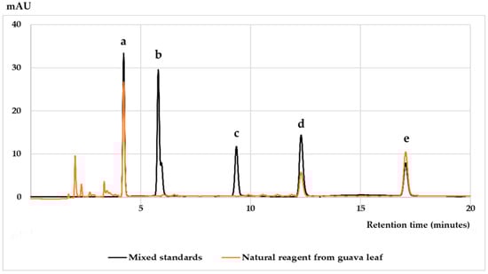 HPLC chromatograms of mixed phenolic compound standards and natural reagent from guava leaf. The peaks are (a): gallic acid; (b): gallocatechin; (c): epigallocatechin; (d): catechin; and (e): ellagic acid.