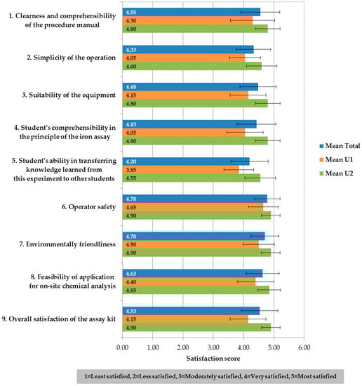 The responses from all 40 students regarding their satisfaction with the experiment using the natural-reagent iron assay kit as a learning material are shown in Figure 4. Overall, the satisfaction scores evaluated by 40 students from the chosen universities (two universities, 20 students each) showed that the average score for every question was higher than 4.00 (full score = 5.00) points, meaning very satisfied, with the average satisfaction on the natural-reagent iron assay kit of 4.55 ± 0.64. The three issues that had the highest scores were the operator safety (4.78 ± 0.42), the environmental friendliness (4.70 ± 0.46) and the suitability of the equipment (4.63 ± 0.54), respectively. The issue with the lowest score (4.20 ± 0.61) was the student’s ability in transferring knowledge learned from the experiment to other students. The score of the student’s ability in transferring knowledge given by applied science students in the university U1 was surprisingly below 4.00 points, meaning moderately satisfied. Nevertheless, the satisfaction scores evaluated by pharmacy students (U1) were lower than those by chemistry students (U2) with the significant differences (statistically tested by independent t-test, p < 0.05) in all issues, except issue 6—Operator safety (p = 0.06).