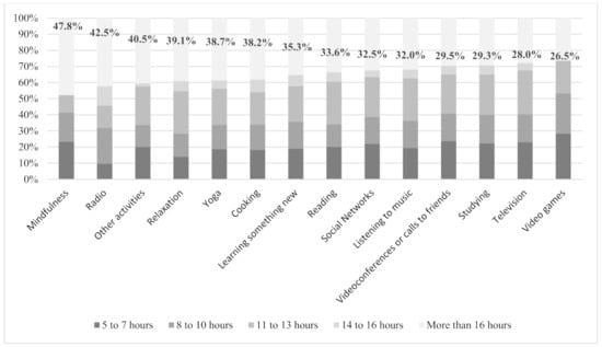 Lastly, we wanted to discover if there was a relation between the leisure activities performed by the Olympic athletes in their confinement and the training hours (see Figure 1). The results highlight an important trend: those who spent more time with digital leisure pastimes (video games, video conferences, television and social networks) spent less time training, and those who spent their leisure time in relaxing activities (mindfulness, relaxation, yoga, cooking, learning something new or other activities) trained more hours on average during the confinement. At the extremes, among those who practiced mindfulness during the confinement, 48% trained during 16 or more hours per week, and among those that spent their time playing video games, 27% (twenty points less) trained 16 or more hours per week.