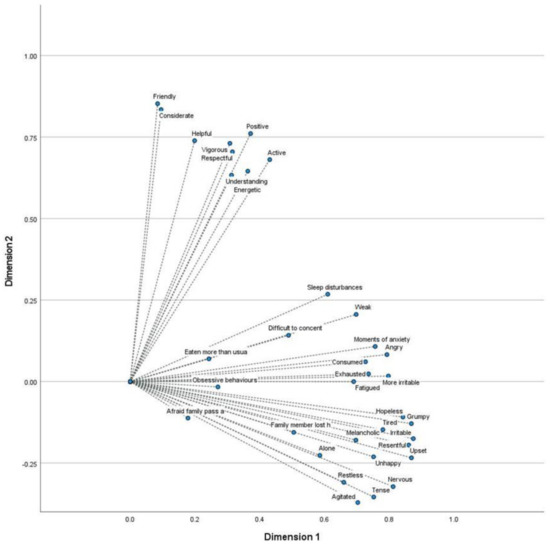 The first dimension clearly refers to the emotional state of the athlete, highlighting the questions referring to mood, irritability, bad temper, etc. The second dimension, in contrast, with a smaller number of variables, seems to refer more to questions of a social character, and thus not to the mood of the athlete, but to their relationship with other people and their physical sensations. These dimensions can be seen in Figure 2 through the positioning of each of the variables in the space formed by the two dimensions. We can see that most of the variables that describe emotional states are situated in dimension 1 with positive values, showing the positive value of dimension 1′s negative emotional states. Equally highlighted is the possibility that a relative could lose their job as a negative emotional element. Regarding dimension 2, the variables that have the most influence are a group that reflects the emotional situation, but more related to the physical sensations of the athletes and their social effects, with this dimension being positive when the variables are positive.