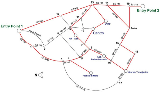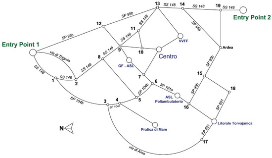 The authors surveyed all the urban centers and acquired information through the geolocation of a mobile GPS device that tracked and shared the routes [43]. Figure 3 represents the graph of the overall road network: the focal areas are the big points, while small nodes are road intersections identified by numbers ranging from 1 to 19 and the name Ardea that identifies a town 10 km to the south. Each arc is identified by the name of the existing road.