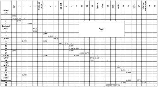 Given the graph in Figure 3, the minimum network with total connectivity is composed of 27 arcs; two arcs are essential for MUS (i.e., the arc between node 4 and the focal area “Pratica di Mare”, and that between EP2 and node 19). The analysis of the overall network availability gives D in Figure 4. Each non-null entry returns the availability of the arc that joins the nodes.