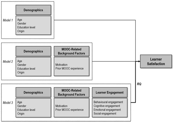To answer the research question, the researchers build three regression models to ascertain the degree to which learner satisfaction is influenced by (1) demographics, (2) MOOC-related background factors, and (3) behavioural, cognitive, emotional, and social engagement. The research framework is displayed in Figure 1.
