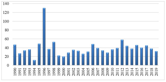 The number of departures from Certeze * between 1990 and 2019. Source: NIS, 2021a [71] (* statistic data refer to the settlement of Certeze, including all the three component villages).