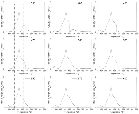 However, some differences may be observed with respect to the thermal decomposition of lignin over the 350–450 °C pyrolysis temperature range. At a pyrolysis temperature ≥ 450 °C, the DTG curves of the EGM sample contain one broad peak with three shoulders. At a lower pyrolysis temperature ≤ 400 °C, the overlapping effects between cellulose, hemicellulose and lignin decompositions are limited, and two peaks can be distinguished.