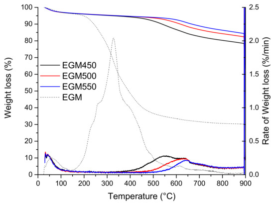 The TG and DTG thermograms of the three biochars are presented in Figure 5. For the three samples, the following two main regions of weight loss were observed: the lower temperature loss (25–150 °C) corresponds to the desorption of water, while the higher temperature loss, between 400 and 900 °C, could be attributed to the release of volatile organic compounds or/and loss of mineral compounds/salts not released during the pyrolysis process at a low temperature. As expected, the greater mass loss occurs for the biochars pyrolyzed at lower temperatures. By examining the DTG thermogram, EGM500 and EGM550 biochars gave a single DTG peak located at around 650 °C with a very small shoulder at 700 °C. EGM450 has an additional DTG peak located at a lower temperature, around 550 °C. This peak can be attributed to the presence of a small fraction of lignin that might not be totally decomposed during the pyrolysis process.