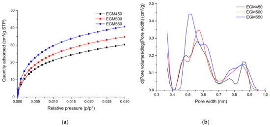 (a) Adsorption isotherms of CO2 at 0° and (b) pore size distribution for EGM-based biochars.