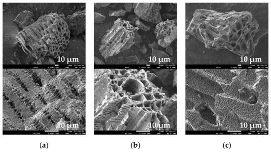 The SEM images (Figure 8) revealed a heterogeneous and porous structure of EGM-based biochar particles. The heterogeneity feature is derived from the complex composition of grape marc (seeds, stalks and skins). On the other hand, the porous nature of these materials originates from the precursor plant cellular structure of EGM and from the gas evolved during the pyrolysis process [41]. The EDX spectra (not shown) indicate that the chemical compositions of the different structures are similar. The presence of carbon, oxygen, calcium and potassium can be readily detected.