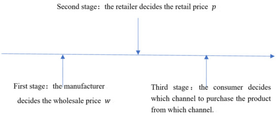 First, we start with the traditional single channel supply chain model, which is formulated with a manufacturer, a traditional reseller, and a continuum of consumers with heterogeneous preferences, in which the reseller operates a physical channel. As the Stackelberg game leader, the manufacturer first decides the wholesale price, and then the reseller determines the retail price. The consumers whose valuation satisfies will purchase the product. The demand function is . The game sequence is as follows (as shown in Figure 1).