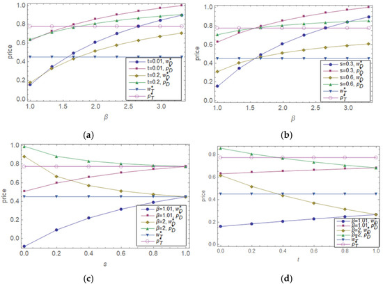 Impact of β, s, and t on prices. (a) Impact of β on price with s = 0.3, (b) Impact of β on price with t = 0.01, (c) Impact of s on price with t = 0.01, (d) Impact of t on price with s = 0.3.