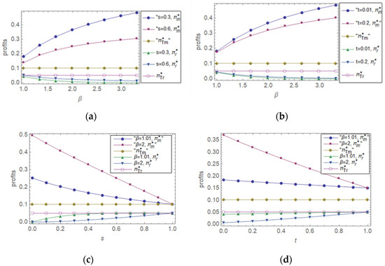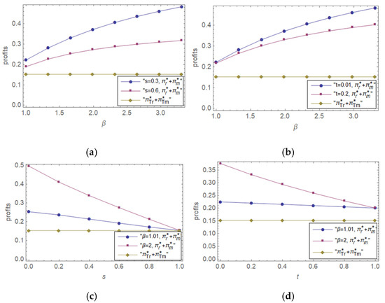 5.1.3. Impact of β, s, and t on Partners’ Profits