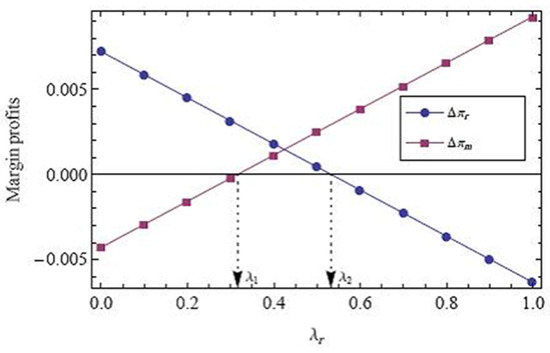 In this subsection, when , , , and , other parameters are kept constant, but the contract parameter varies. To reflect the results of a win–win situation with the revenue-sharing contract (see Proposition 4), we focus on the impact of the contract parameter on the margin of profit and then observe some interesting patterns, as summarized in Figure 5.