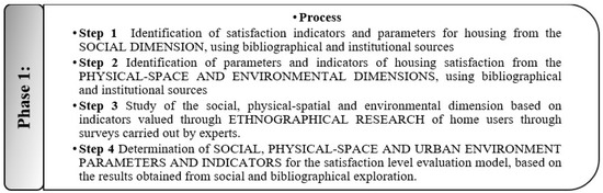 In this phase of the methodology, the satisfaction parameters and indicators for housing are determined based on the social, physical, spatial, and inter-urban aspects. These are obtained from the analysis of bibliographical sources, from the ethnographic analysis carried out on the housing occupants, and from the research contrasting the previous points, for which a number of steps is necessary, see Figure 3.