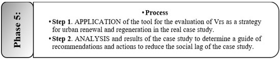 At this phase, a survey model was also designed which included the system of parameters and indicators detailed in Phase 1 (Table 2) and allowed the level of satisfaction in the Vrs of the defined sample to be assessed (see Appendix D). The Likert psychometric scale (system of indicators used in questionnaires for research to evaluate the opinions and attitudes of a person, measuring the level of agreement or disagreement of the respondent) was chosen in order to obtain information which statistically showed a mean or average trend. This scale was considered to be suitable for measuring the degree of satisfaction of the users of the socially disadvantaged homes studied, establishing the validity and confidence of the results obtained for the spatial, physical and urban environment dimension. This follows the methodology used in another study [58] which recommended an evaluation system with five response categories, i.e., totally unnecessary, somewhat necessary, moderately necessary, necessary, and very necessary.