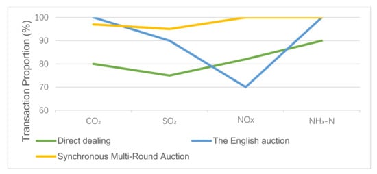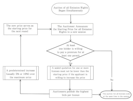 In the late 20th century, the pollutant auction mechanism mainly focused on the SO2 auction [26,33]. But with the development of industry, SO2 based pollutant auction has been unable to meet the needs of most enterprises for pollutant emission rights. Since the 21st century, the research has shifted to the auction mechanism of CO2 as the main pollutant. Most scholars agree with the comprehensive auction transaction for pollutants [34,35]. But Huebler [36] argued that a full auction of carbon allowances would be difficult to implement because of the macroeconomic effects. More scholars design pollutant auction mechanisms such as the ETS simulation model based on multi-agent and dynamic double-effect adjusted auction [37,38]. In the following study, Cong [39] finds that when there are many bidders and no obvious collusion, it is more efficient to use a British watch auction. Conversely, it is more efficient to use discriminatory price auctions. Jiang [40] believed that the effectiveness of auctions depends on whether the market is fully competitive. Some studies also discuss the application of consignment auctions in pollutant trading [41,42]. Wang creatively proposed a multi-round auction model for carbon emissions, with a floating cap on carbon emissions, believing that dynamic auction is conducive to price stability [43]. Sun proposed the RAEP dual auction model for Beijing’s emission rights auction, believing that it can effectively improve the auction efficiency [44].