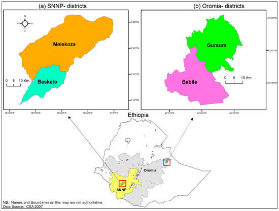 Map of Ethiopia showing the study sites shown with red squares: (a) SNNP districts (Melekoza and Basketo); (b) Oromia districts (Gursum and Babile). CSA, Central Statistical Agency; SNNPS, Southern Nations, Nationalities, and Peoples’.