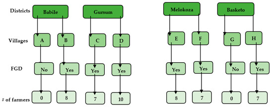 Sampling structure for the focused group discussions (FGDs) in study districts. Villages are denominated as follows: A, Eibada Gemechu; B, Ramata Salama; C, Abadir; D, Oda; E, Salaysh Mender 01; F, Salaysh Mender 03; G, Angela 03; and Angela 04.