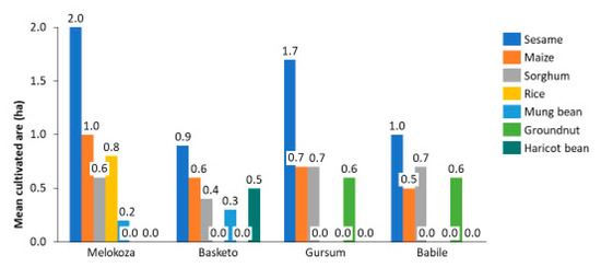 Mean cultivated area (ha) allocated for different crops grown in the study districts in the 2020/2021 cropping season.