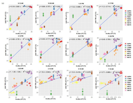 Tables S28 and S29 record the data under the rainfall conditions from 4:00 p.m. to 7:00 p.m. on 26 July 2020. The data shows that the temperature difference of the land surface of the lawn measured by the two observation methods before rainfall was 3.8 °C, and for the other land surfaces, the temperature difference was small; after the rainfall stopped, the temperature difference between the pervious brick surface and the concrete surface measured by the two observation methods doubled. This is because the UAS lens is far away from the ground during measuring, and the lens receives the solar radiation reflected from the ground. After the rain, the temperature was lower and the air humidity was higher, which caused the heat radiation to attenuate during the transmission process. In contrast, the in situ observation was closer to the ground and received the solar radiation reflected by the ground at a closer distance. This study carried out seven consecutive observations on rainfall from 9:00 a.m. to 9:00 p.m. on 2 August 2020. The data in Table S7 shows that concrete and asphalt are the two land surfaces with the fastest temperature rises in the study area on a sunny day. The similarity is consistent with the previous two observations. The data in Table S8 shows the same conclusion as the previous rainfall event. Before the rainfall, the influx of clouds blocked part of the solar radiation. UAS calculates the surface temperature based on the amount of heat radiation received by the lens, which resulted in a large error (about 3.0 °C) in the temperature of the asphalt land surface before and after the rainfall event. The data in Table S11 show that UAS showed a small error after rainfall, while the error of each observation on the land surface of the lawn was large. In this observation, UAS showed good accuracy, indicating that UAS equipped with thermal infrared lenses can be used in the observation and research of urban surface temperature. Figure 11 shows the linear regression analysis results of the three-day observation data of in situ LSTs and UAS LSTs.