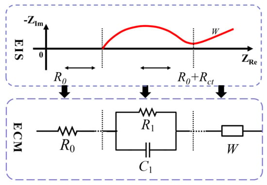 Electrochemical impedance spectroscopy (EIS) is mainly used to diagnose electrochemical systems to interpret the electrochemical process inside a system by determining impedance changes with sinusoidal frequency, allowing the model to be characterized for reasons such as studying the limitations or for performance enhancement. It requires accurate modeling to explain the impedance change and the associated dynamics; the most used method to do that is equivalent circuit models (ECM). In this technique, the EIS data is converted to meaningful physical quantities and qualities that represent the electrochemical process in terms of capacitance (C), resistance (R), and phase element (CPE), which can be connected in serial or parallel in the model. EIS advantages are: quickness and accurate readings can be obtained from exposure to actual conditions, e.g., open-circuit voltage, demonstrate and validate the model reaction, and low cost. However, understanding the whole system demands a meaningful analysis of the whole electrochemical environment to interpret the obtained spectrum from EIS, which can be complex sometimes as electrons pass through numerous impedance elements. Depending on the components’ nature and characteristics, they will vary to reflect the electrochemical reactions and polarization time constant, causing different frequency variations [31]. On the other hand, equivalent circuit modeling (ECM), see Figure 1, is used for describing the battery-electric behavior effectively by electrical elements representation for battery modeling. It is sensitive to a battery’s external conditions to show impedance response because we deal with an entire system that does not ideally behave throughout time. They can precisely describe the complete system, and it is much easier to interpret the whole system by it because in real-world applications about EIS spectra, there are no perfect half-circuits that need our modeling technique.