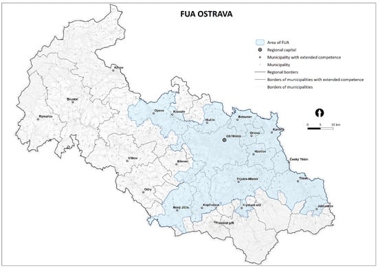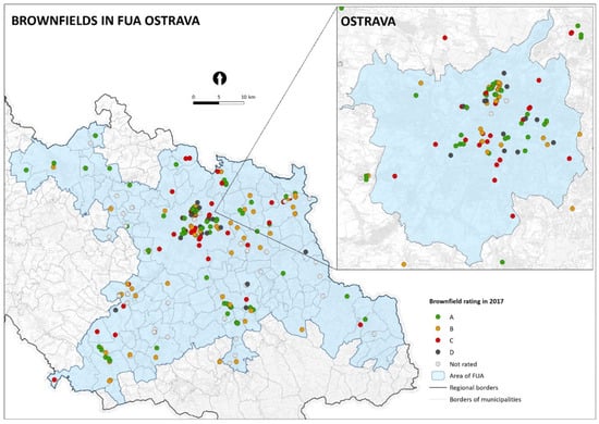 To evaluate the categories of brownfields, the area of Functional Urban Area (FUA) Ostrava (part of the Moravian-Silesian region)—the Ostrava agglomeration—was selected. The area consists of 119 municipalities and has 965,338 inhabitants. It concentrates 86% of the population of the Larger Urban Zone Ostrava and 79% of the population of the Moravian-Silesian region (with 35% of its territory). The population density in FUA is approximately 509 inhabitants per km2 [].