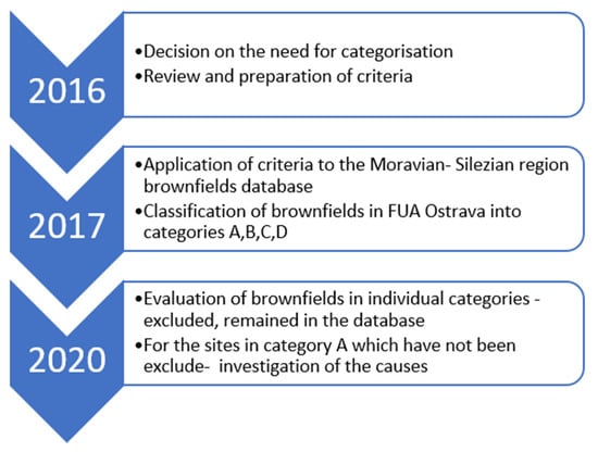 It is important that the criteria for assignment to ABC categories are as simple and easy to update as possible, while sufficiently affecting the site’s potential for regeneration. We assumed that it was possible to create a system for assessing the potential of brownfields that would be simple, easy to apply, and at the same time provide the right results. After almost 10 years of active work with the Moravian-Silesian brownfield database, the authors have developed a very simple method of assessment (categorization into ABC(D) categories), which does not require complex formulas, complicated information gathering or statistical evaluation. The whole system is based on three objective and one subjective criterion as described further in the methods section. Based on the verification with an interval of 3 years (the results of verification are mentioned in Section 3, “Results”), we prove that our method is a functional and effective.