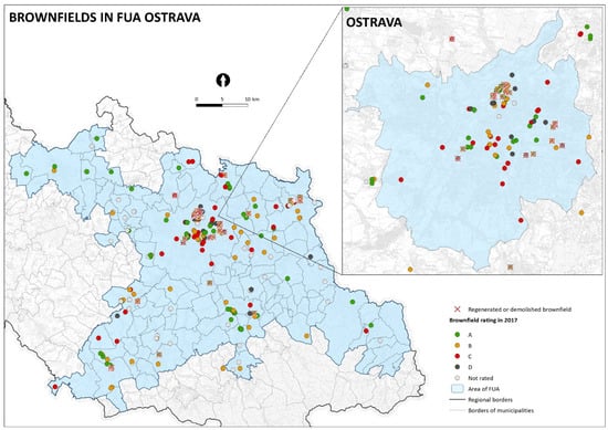 The distribution of the brownfields site within Functional Urban Area (FUA) Ostrava in 2017.