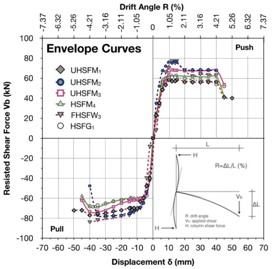 Envelope curves of the hysteresis loops of subassemblages UHSFM1, UHSFM2, UHSFM3, HSFM4, FHSFW3 and HSFG1 tested on previous works [38,39].