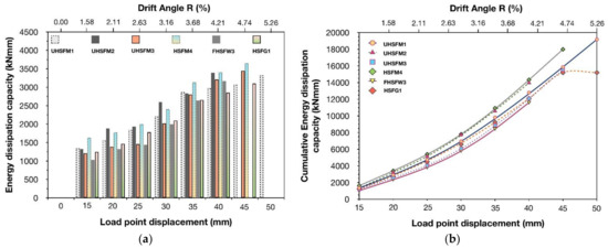 The effectiveness of both innovative retrofit schemes, which include the use of HSFC and UHSFC jackets, is further substantiated by the experimental results regarding the energy dissipation capacity of the strengthened subassemblages. All specimens exhibited a ductile dissipating hysteresis behavior which was reflected by spindle-shaped hysteresis loops without pinching around the axes [38,39]. It is noteworthy that the amount of seismic energy dissipated in the plastic hinges formed in the beams of the retrofitted beam-column joint subassemblages, UHSFM1, UHSFM2, UHSFM3, HSFM4, FHSFW3 and HSFG1, showed a significant and continuous increase during consecutive cycles of the earthquake-type loading (see Figure 2a). This indicates an absence of shear damage in the joint region which is favorable for bond conditions between steel bars and concrete and hence allows the yielding of the beam longitudinal reinforcement and overstrength development. In the plots of energy dissipation capacity versus load point displacement, shown in Figure 2a, an increase of 246.84%, 255.85%, 285.12%, 223.93%, 307.28% and 249% in the dissipated energy value at the end of the testing with respect to the corresponding value during the first cycle of loading for specimens UHSFM1, UHSFM2, UHSFM3, HSFM4, FHSFW3 and HSFG1, respectively, was observed.