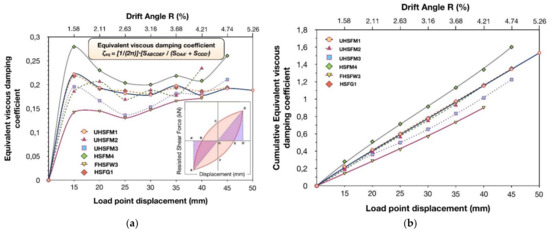 The cumulative dissipated hysteretic energy of the subassemblages is depicted in Figure 2b. It was clearly demonstrated that the retrofitted specimens dissipated an immense amount of seismic energy through damping in the plastic hinges formed at the beam while the joint region remained elastic during cycling. This is owed to the increased deformability and displacement ductility provided by the innovative HSFC and UHSFC jackets. Thus, another crucial parameter for the seismic performance of the strengthened subassemblages, the equivalent viscous damping coefficient, , is subsequently examined. The latter consists of both the hysteretic and the elastic damping, while relating to the inelastic characteristics and the deformation capacity of the strengthened members. In particular, is expressed as the ratio of the dissipated seismic energy within a given cycle of the earthquake-type loading to the elastic strain energy corresponding to this cycle (see Figure 3a). Furthermore, the values of are higher for structural members which show dissipating hysteresis response. On the contrary, poor and rapidly degrading hysteresis behavior is related to possible collapse due to cumulative seismic energy under small deformations. In Figure 3a,b, the values of the equivalent viscous damping coefficient per cycle of loading and the values of cumulative equivalent viscous damping coefficient are presented. All specimens showed high values of due to their increased energy dissipation capacity.
