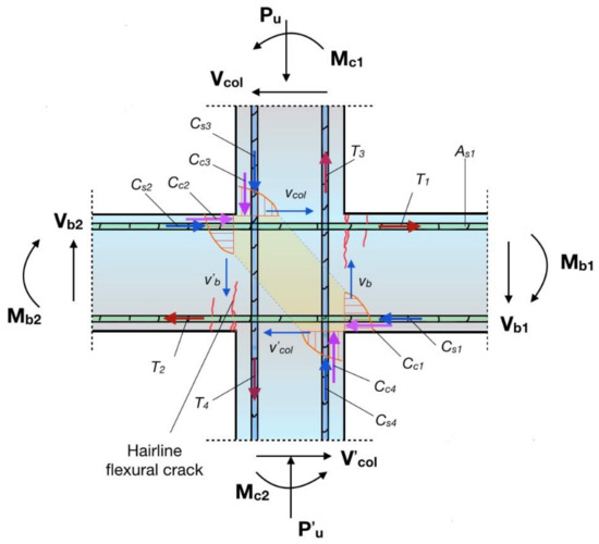 It is known that the compression strength of concrete in the joint core, that is subjected to tension and compression stress, affects both mechanisms and hence controls the ultimate strength of the joint. The latter is limited by the gradual crushing along the cross-diagonal cracks and especially along the potential failure planes (see Figure 4a,b).