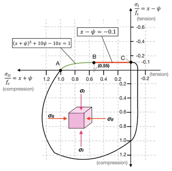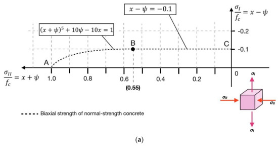 Thus, each couple of values (, ) represents a point of the concrete biaxial strength curve according to Equation (15).