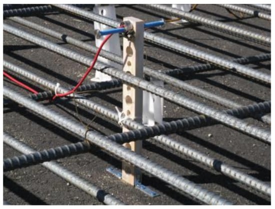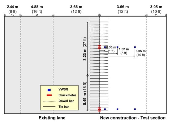 Figure 1 shows the overview of field instrumentation. As shown in Figure 1, each test section has two types of gages installed: one is a vibrating wire strain gage (VWSG), and the other is a crackmeter. In order to estimate the risk of longitudinal cracking in CRCP, three VWSGs were installed in the transverse direction at a depth of 25.4 mm (1 in.) from the surface of CRCP, as shown in Figure 1 and Figure 2. Figure 1 also shows the detailed location of VWSGs installed in each test section. These VWSGs were placed at different distances of 0.30 m (1 ft), 1.52 m (5 ft), and 3.05 m (10 ft), respectively, from the LCJ. The strain measured using VWSG was used to estimate the strain and stress in the transverse direction and consequently assess the risk of longitudinal cracking in CRCP []. Although the longitudinal joint on the right side within the new section (see Figure 1) may have affected the reading of VWSGs, it was assumed that the effect on the VWSGs was the same at equal distances. Therefore, we considered that the variation in concrete strain measured from VWSGs depending on the distance from the LCJ between the existing and new lanes was caused by the difference in degree of restraint between the tie and dowel bars.