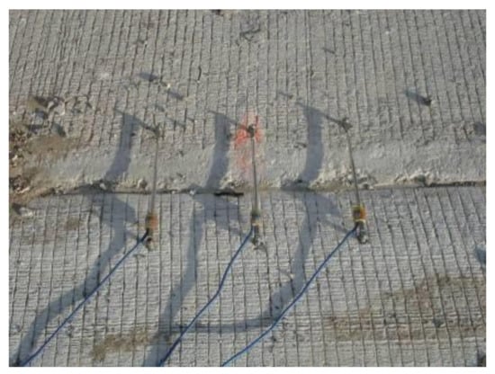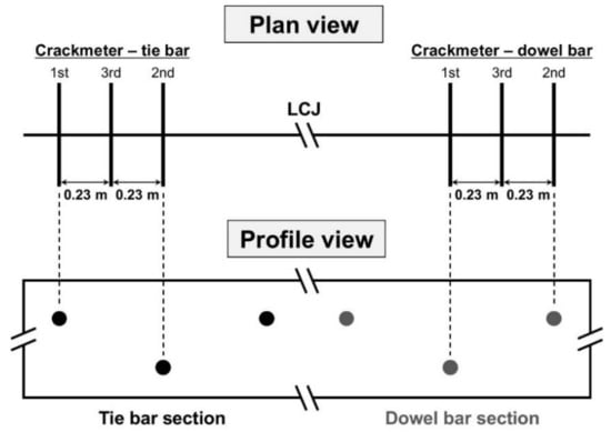 Crackmeters can measure the displacement of CRCP at the surface []. These were installed across the LCJ on the 82nd day from concrete placement. Figure 3 shows crackmeters installed in each test section. Because each test section has two layers of tie or dowel bar, three crackmeters were placed across the LCJ: the first one is located on the vertical extension of the top layer of the bar, the second on that of the bottom, and the third between the top and bottom, at intervals of 0.23 m (0.75 ft), as shown in Figure 4. The different variations of displacement were expected to be measured using each of the crackmeters because the measured concrete element would be restrained differently, depending on the distance from the bars.