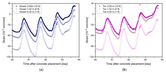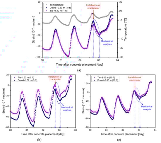 Figure 5a shows the variation in strain due to temperature variation at 0.30 m (1 ft). Although the concrete strain was measured through concrete placement, only a portion of the data is shown because it represents the overall trend of variation in the entire monitoring period. As expected, the variation in concrete strain was close to the overall variation in temperature. Given the same variation in temperature, the variation in strain in the dowel bar section was greater than that in the tie bar section. This indicates that the movement of the measured concrete elements was more strongly restrained by the tie bar than the dowel bar, which agrees with the current practice. However, the difference in restraints is not as significant as was expected. The data measured during the period from the afternoon of the 82nd day to the morning of the 83rd day was used in the mechanical analysis, which has been explained further in this study, in order to estimate the transverse stress and the risk of longitudinal cracking in CRCP. Figure 5b,c show the variation in strain due to temperature variation at 1.52 m (5 ft) and 3.05 (10 ft) away from the LCJ, respectively. Similar to the strain at 0.30 m (1 ft), the tie bar restrained more movement of the concrete element, and thus lesser variation in strain was recorded in the tie bar section than the dowel bar section.