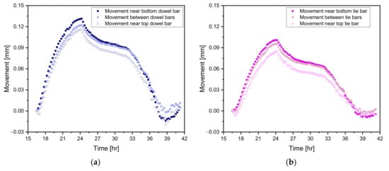 Figure 7 shows the transverse displacement across the LCJ, measured by crackmeters in the dowel and tie bar test sections, respectively. As mentioned earlier, three crackmeters were installed at the surface at different distances from the dowel and tie bars in each test section. In both sections, the least movement occurred when the tie or dowel bars were closer to the pavement surface and increased with an increase in distance, as shown in Figure 7. This implies that more restraint is caused by the top layer of the dowel or tie bars and less by the bottom layer of the bars. It also indicates that the tie bar provides CRCP with more restraint in the transverse direction than the dowel bar because the variation in movement is higher in the dowel bar section than in the tie bar section, as shown in Figure 7.