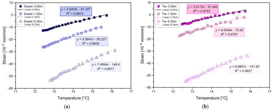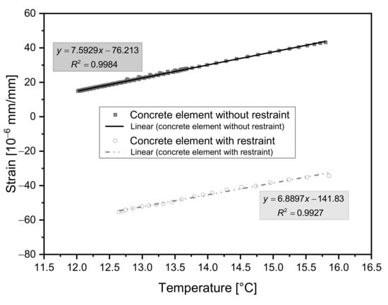 If there is no restraint on concrete volume changes, the slope of the line should be close to the slope of the unrestrained concrete that is equal to the coefficient of thermal expansion (CTE) []. Therefore, Equation (7) can be expressed in terms of CTE:
