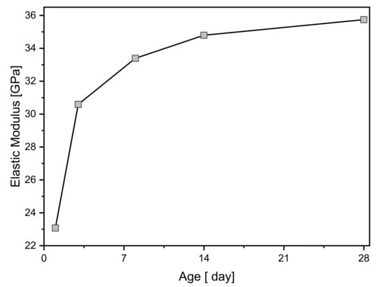 Figure 9 shows the variation in measured strain along with the temperature changes with and without NC in the field. As shown in Figure 9, the difference in concrete strain was markedly different depending upon the presence or absence of NC, which proves the effectiveness of NC for the prevention of the transfer of stress. In addition, a good correlation was obtained between variations of strain and temperature. As described in Section 4.2, the CTE of the concrete, which corresponds to the slope of the linear regression line of the unrestrained concrete in the graph, was 7.59 × 10−6 mm/mm/°C. Figure 10 shows the measured elastic modulus of the concrete. The modulus of concrete at the 28th day was 35.74 GPa. Furthermore, these values were used to calculate the stress variation given by Equation (11).
