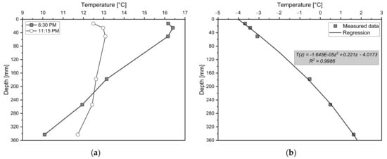 Figure 11 shows the temperature profile and gradient of the test section. Figure 11a illustrates the temperature distribution along the depth of the tie bar test section during the specified period, as shown in Figure 5. As expected, a higher variation in temperature occurred at the top surface of the test section. The given temperature profile and gradient, which is used in the mechanical analysis, is shown in Figure 11b. The second order polynomial was used in the regression of the temperature gradient [].