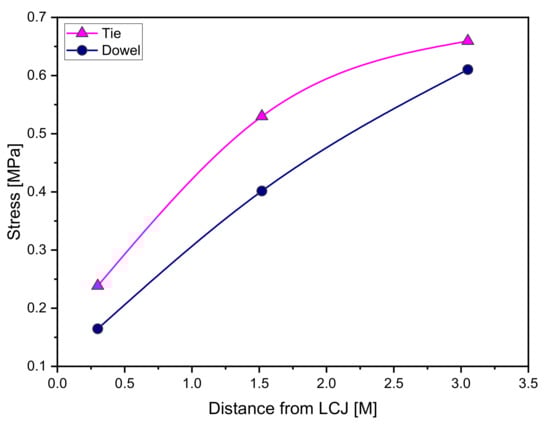 For the given temperature gradient, the stress development in the concrete element in the transverse direction can be calculated with the known CTE, degree of restraint, and elastic modulus (refer to Equation (11)). Figure 13 shows the calculated stress of concrete elements at different distances from the LCJ. It indicates that higher stress develops as the distance between the element and the LCJ increases. The tie bar restrains the movement of the slab at the LCJ and thus leads to higher stress development. The mechanical analysis results are consistent with the field measurements, as shown in Figure 5 and Figure 6. Although field measurements for a specific period of time were used for mechanical analysis, similar results can be obtained even with measured data from other periods because the strain behavior of concrete in the tied and doweled sections according to temperature and distance from the LCJ represents consistent trends, as shown in Figure 5 and Figure 6. Therefore, it is considered that the mechanical analysis results are reliable and have representativeness. However, this result may vary depending on the field conditions, and thus further studies in this area are required.