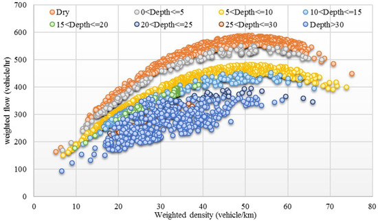 The relationships in Figure 2 show the MFD shape as a change in the traffic operation of networks under different flood levels. The traffic situation in this area in Thailand is critical traffic jams. Probe data show that average traffic speed is normally about 30 km/h, which generates the maximal traffic volume of about 600 veh/lane/h in dry road conditions. Varying degrees of impact make the MFD shape change, and scatters occur. Dry conditions have different degrees of impact on the stability and certainty of the road network. Flood levels of less than 5 cm only slightly affected the MFD shape change, with clear differences in the MFD shape change for flood levels from 5 to 20 cm. Flood levels exceeding 30 cm had a greater effect on the discrete shape of the MFD. According to the speed–flow–density relationship, flow is the product from speed and density, and can be found from the number of vehicle passing on the reference point. Therefore, flow can be zero when speed and density or both are zero. Density increases to the maximum, which means that vehicles are not moving past the reference point. Thus, flow is decreased after density becomes high.