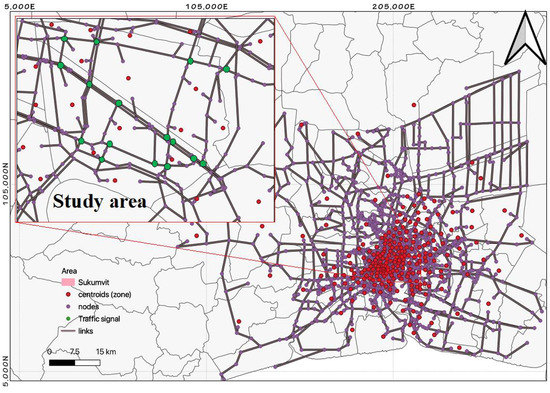 However, the existing Bangkok traffic model, developed in 2017 and called the extended Bangkok urban model (eBUM), is a macroscopic traffic model, developed by the Office of Transport, Traffic Policy, and Planning [27]. Before applying the eBUM model to analyze and forecast transport and traffic situations in the mesoscopic traffic model, we updated the traffic model in 2019 with the most relevant current traffic conditions by using a four-step method. Then, we extracted the road network for the case study of the Sukhumvit area from the updated eBUM model and imported it into a baseline scenario as a new database. The matrix resulting from the transversal assignment was also imported into the new database and used as the demand assigned in the subarea scenario to perform the requisite adjustments. The subarea model consisted of 88 zones, 207 nodes, 766 links, and 16 traffic signals, as shown in Figure 3.