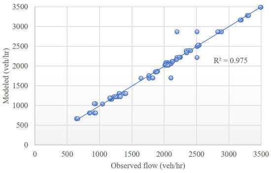 Figure 4 shows a scatterplot graph that compares model flow and observed flow for the morning peak hours between 7:30 and 8:30. Results indicated that the model was well-calibrated, with of 0.975.