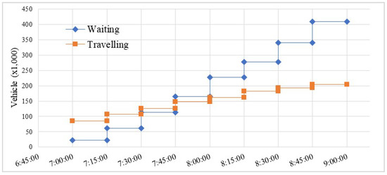 Figure 5 shows the relevant outputs as the number of vehicles waiting to enter the network and the number of vehicles remaining in the network at the end of the simulation. The blue line changed suddenly at the third interval (7:45), reflecting the start of the peak-hour interval until after the last peak interval demand. Over 25,000 vehicles were waiting to enter the road network. These vehicles were stuck on virtual links and could not enter the road network to complete their trips.